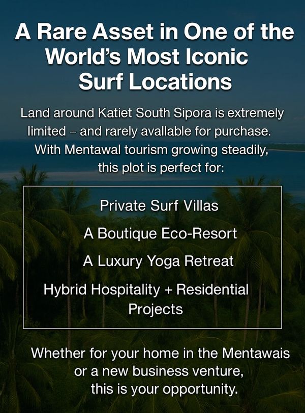 The Mentawai Islands are experiencing rapid growth, making today the ideal moment to secure your position in this emerging market. Significant government investment is transforming local infrastructure, including new roads that make travel across the islands easier than ever. Access has also improved, with multiple weekly flights and four fast ferries connecting the Mentawais to the mainland. Combined with the region’s untouched natural beauty and rising interest from both domestic and international investors, the Mentawais offer a rare window of opportunity—invest now, while the market is expanding and prime land is still available.
